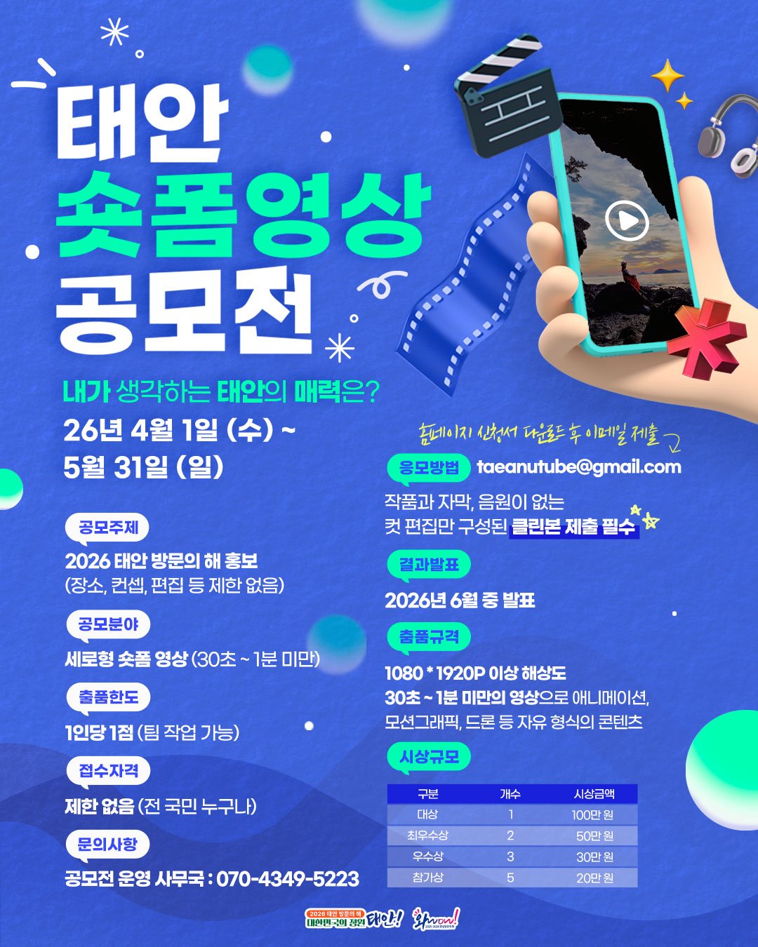 이번 공모전은 최근 SNS에서 숏폼 콘텐츠 활용도가 높아지고 있는 흐름을 반영해 마련됐으며 군은 이를 통해 ‘2026 태안 방문의 해’분위기 확산과 지역 관광 활성화에 도움이 될 것으로 기대하고 있다.
