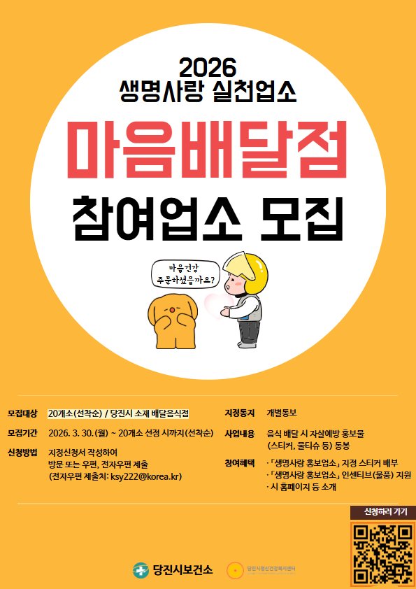 [Ytv영상스토리] 당진시는 지역사회 내 자살 예방 안전망 구축과 1인 가구의 정신건강 위기 극복을 위해 오는 30일부터 2026년 ‘마음배달점’ 신규 참여 업소를 모집한다고 27일 밝혔다.