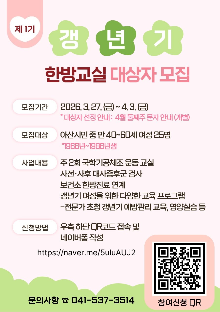 이번 프로그램은 오는 4월 27일부터 7월 6일까지 총 12주간 아산시 보건소 2층 운동프로그램실 및 4층 중회의실에서 운영되며 갱년기 여성의 신체적 정신적 건강 증진을 목표로 다양한 한방 건강관리 프로그램을 제공할 예정이다.