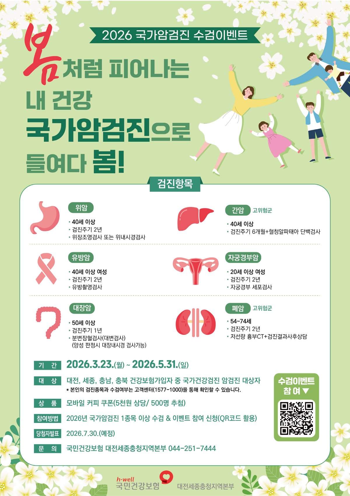 이번 이벤트는 2026년 3월 23일부터 5월 31일까지 진행되며 대전·세종·충청지역 건강보험 가입자 가운데 국가암검진 대상자가 기간 내 검진을 받은 뒤 QR코드를 통해 참여를 신청하면 추첨을 통해 5천원 상당의 모바일 커피 쿠폰이 제공된다.
