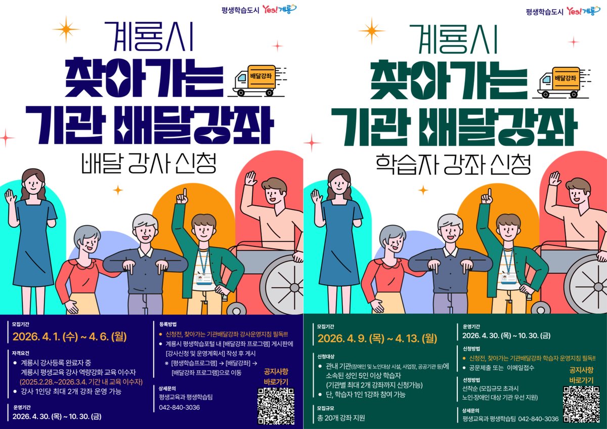 [Ytv영상스토리] 충남 계룡시는 ‘2026년 찾아가는 기관 배달강좌’ 운영을 위해 강사와 학습자를 공개 모집한다고 밝혔다.