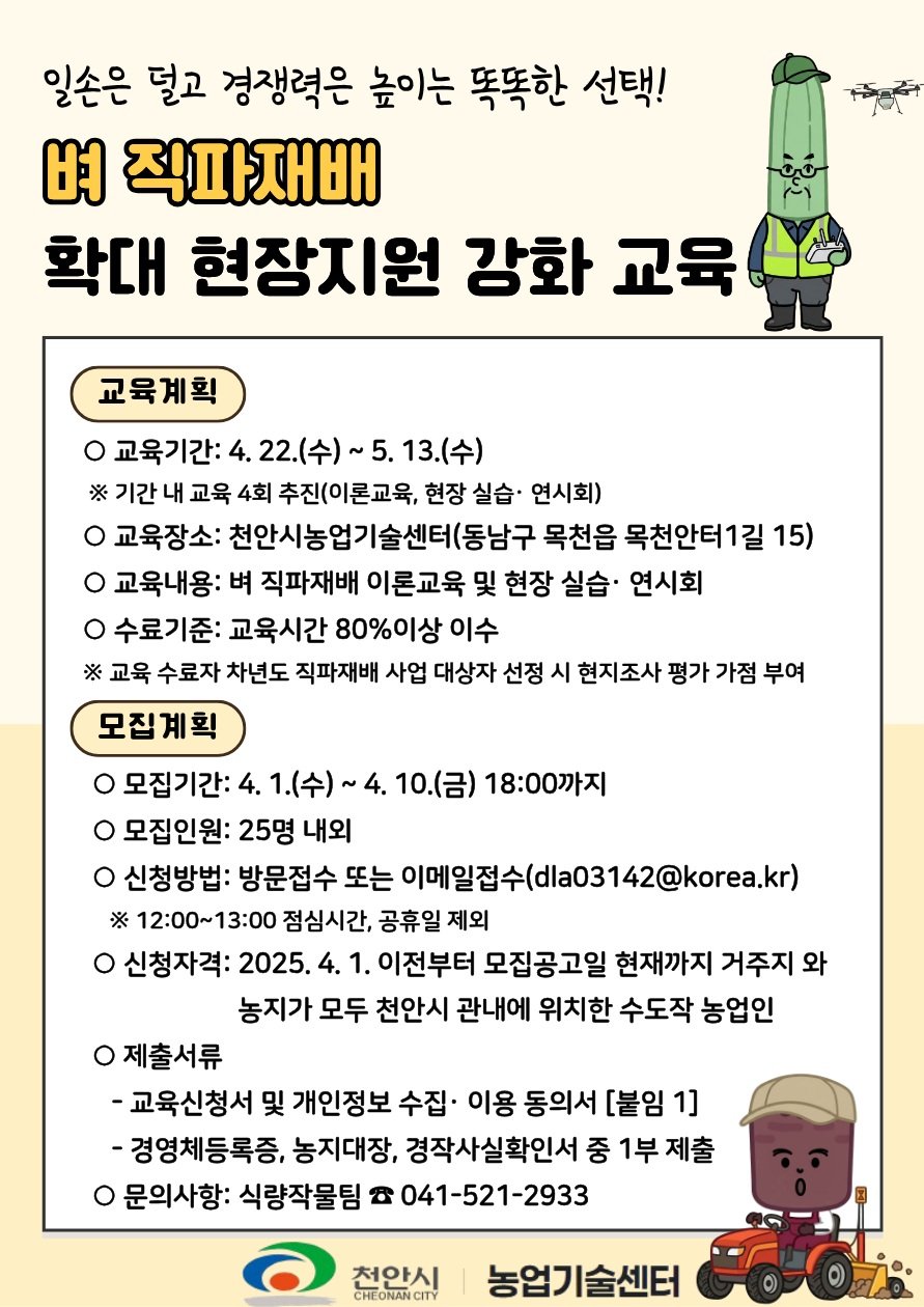 [Ytv영상스토리] 천안시농업기술센터는 오는 10일까지 ‘벼 직파재배 확대 현장지원 강화 교육’ 참여자를 모집한다고 1일 밝혔다.
