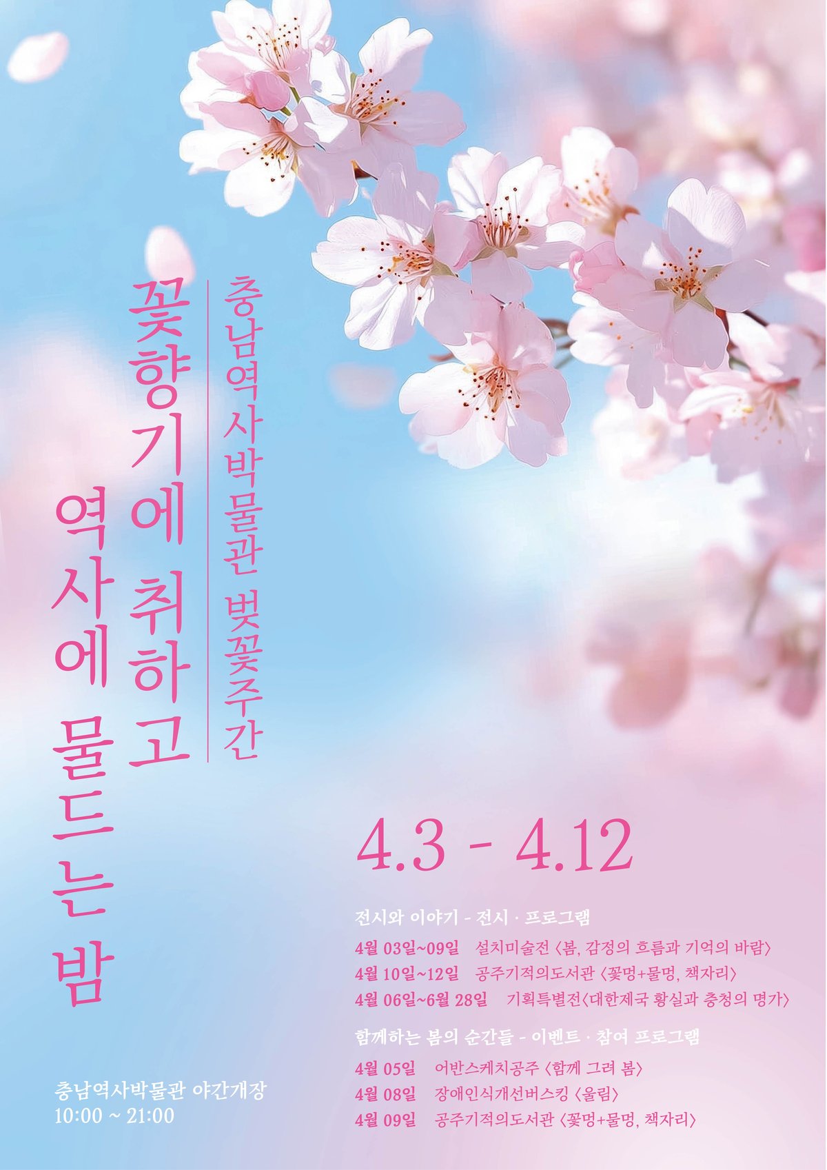 장기승 충청남도역사문화연구원장은 "이번 벚꽃 주간은 역사와 예술, 그리고 지역사회가 함께 어우러지는 풍성한 문화의 장이 될 것"이라며 "가족, 연인, 친구와 함께 박물관을 방문해 꽃향기에 취하고 역사에 물드는 아름다운 봄밤의 추억을 만들어 가시길 바란다"고 전했다.