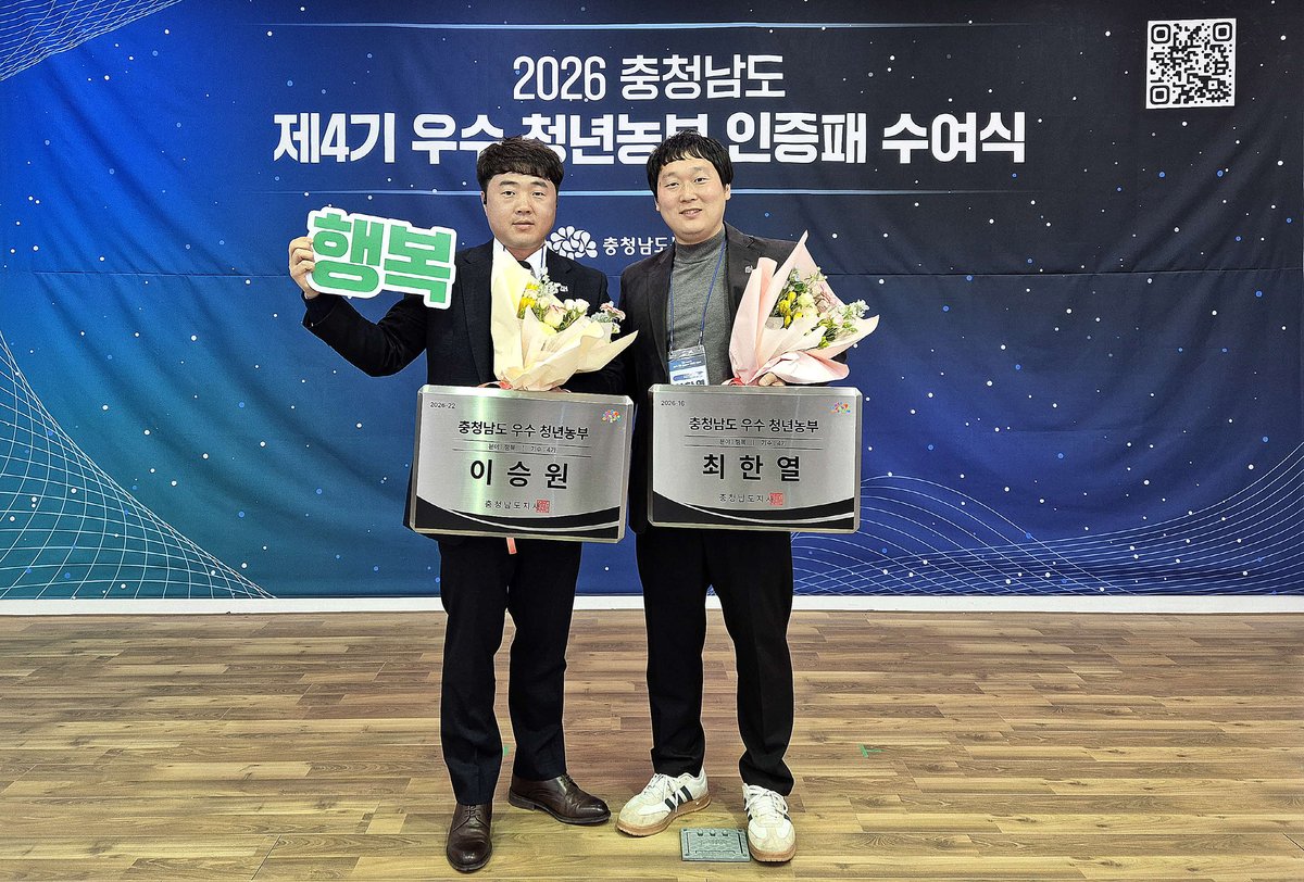 [Ytv영상스토리] 서천군농업기술센터는 지난 2일 충청남도농업기술원에서 열린 ‘제4기 충남 농업 미래리더 인증식’에서 서천군 청년농업인 최한열 씨와 이승원 씨가 충청남도 우수청년농부 인증패를 수상했다고 밝혔다.
