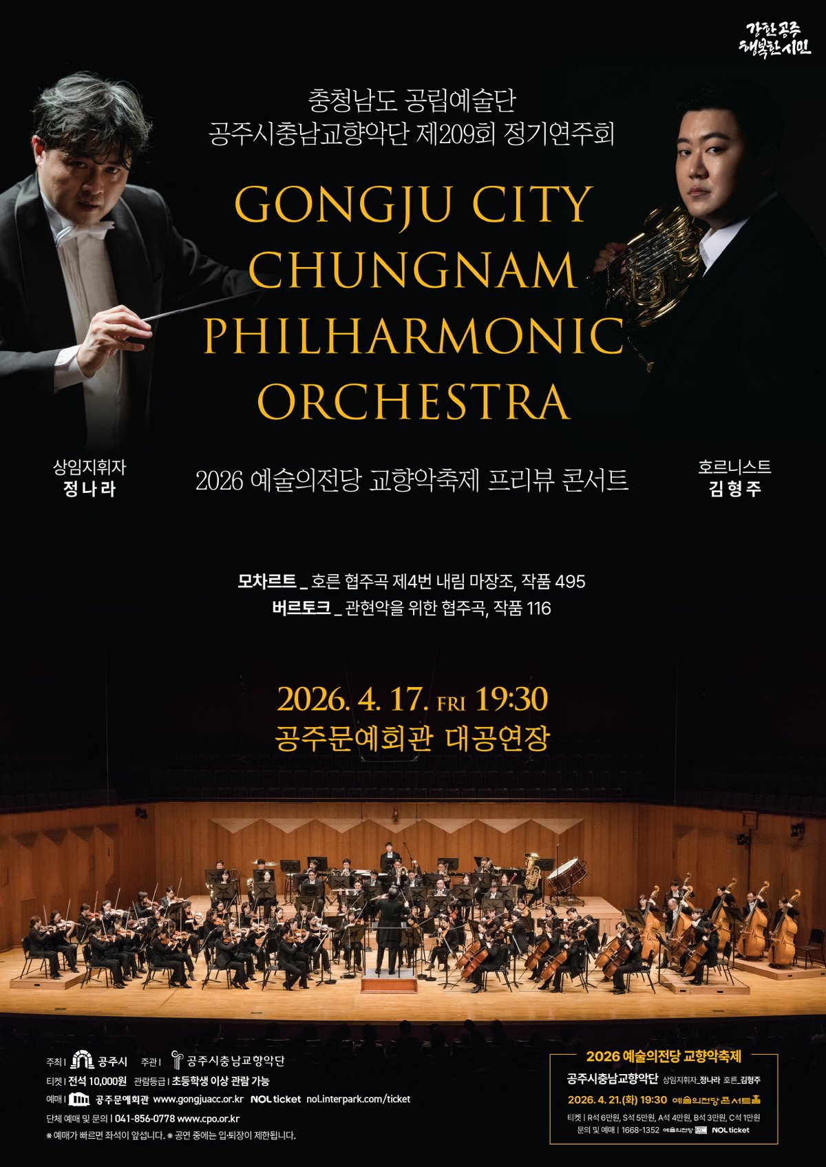 마에스트로 정나라의 지휘 아래, 경기필하모닉오케스트라 수석으로 활동 중인 호르니스트 김형주가 협연자로 나서며 90인조 오케스트라가 함께해 웅장하고 역동적인 선율과 깊이 있는 해석으로 관객들에게 감동을 선사할 예정이다.