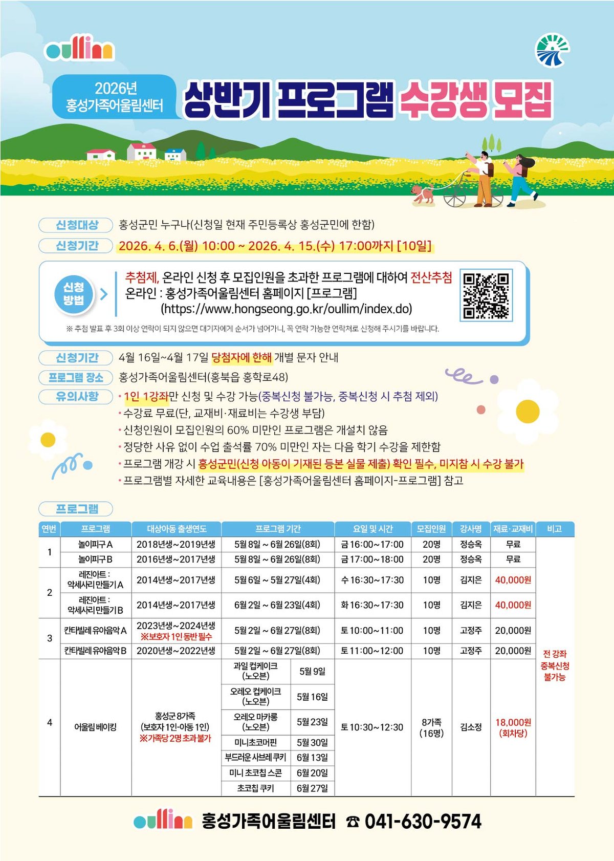 모집 기간은 2026년 4월 6일 10시부터 4월 15일 오후 5시까지로 접수 방법은 홍성가족어울림센터 홈페이지에서 온라인 접수로만 가능하다.