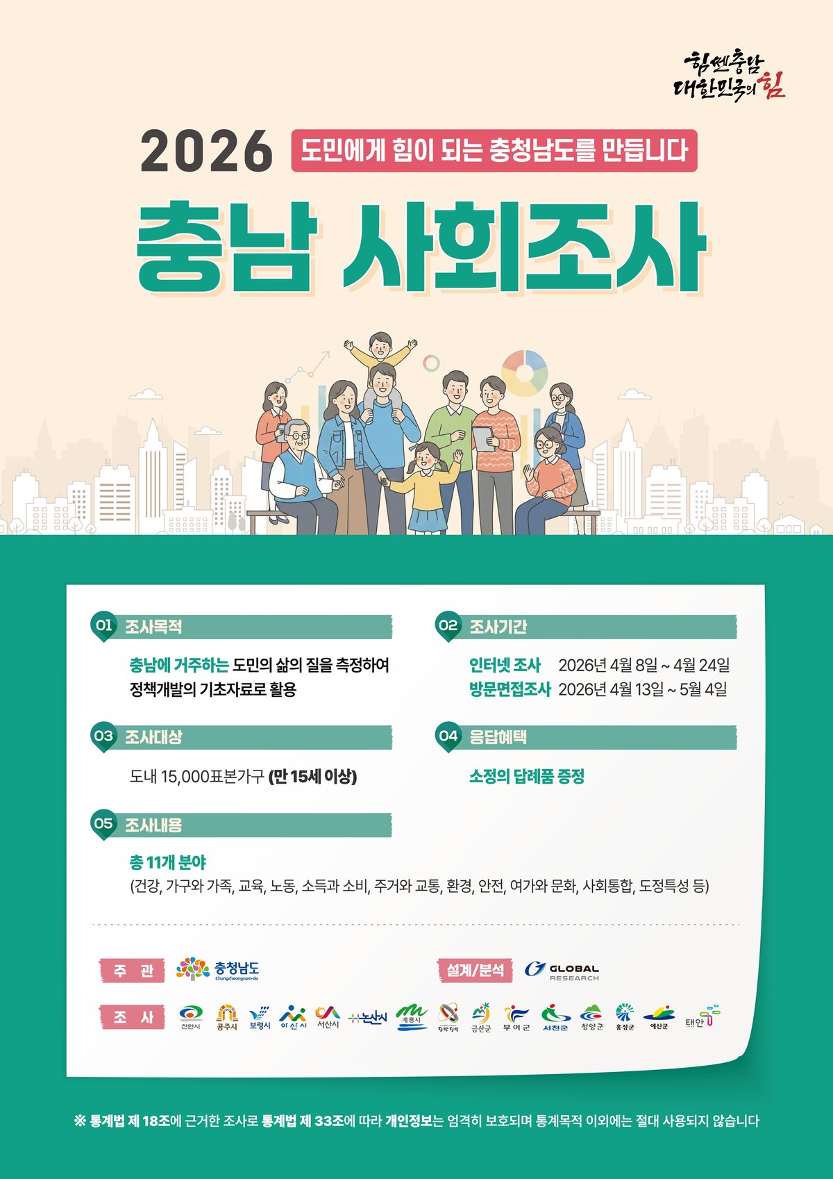 충남 사회조사는 시민의 삶의 질 향상을 위한 지역 맞춤형 통계자료를 제공하고자 매년 시행되는 국가승인 일반통계다.