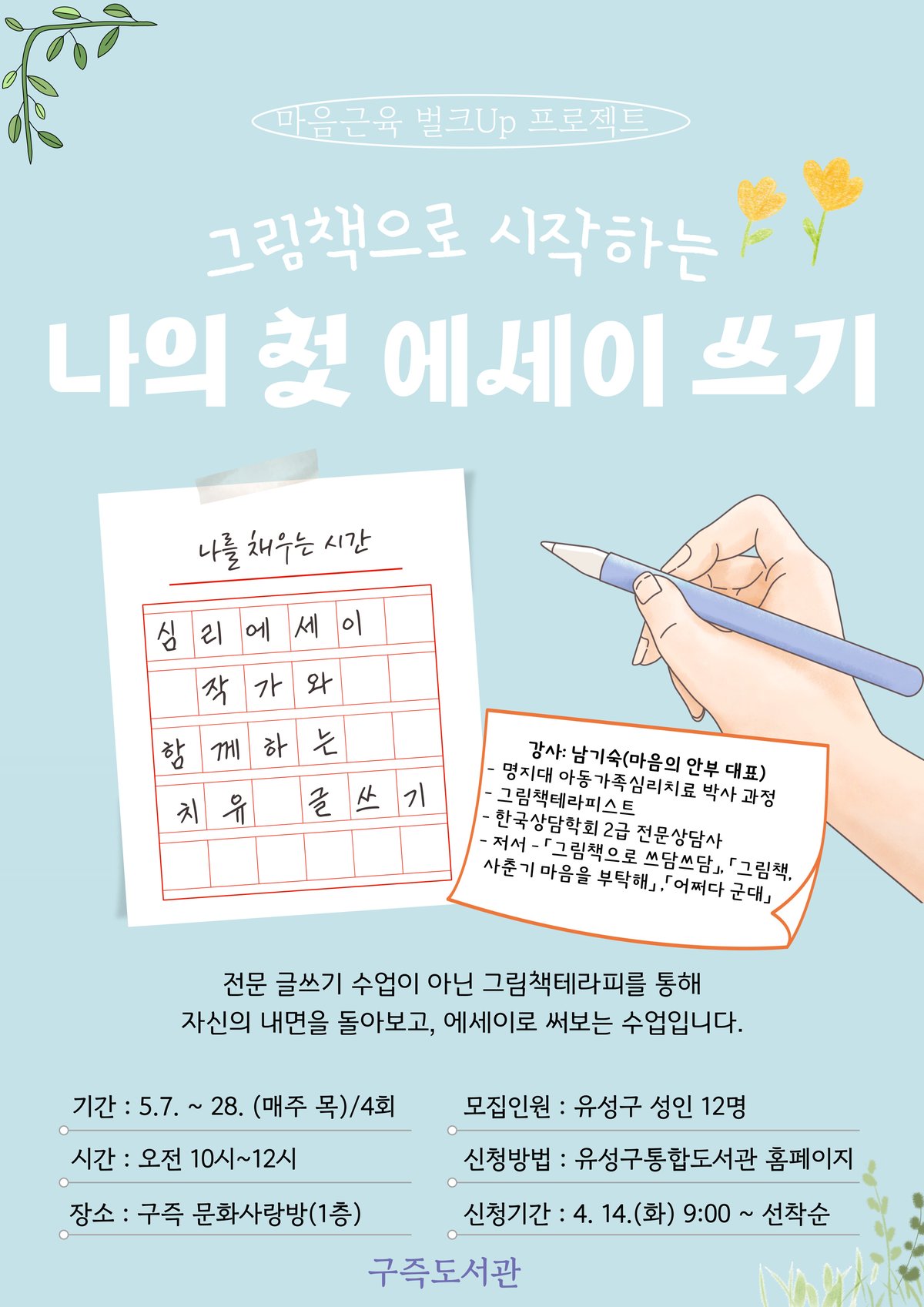 [Ytv영상스토리] 대전 유성구는 5월 7일부터 28일까지 구즉도서관에서 성인을 대상으로 ‘마음근육 벌크UP 프로젝트 그림책으로 시작하는 나의 첫 에세이 쓰기’ 프로그램을 운영한다.