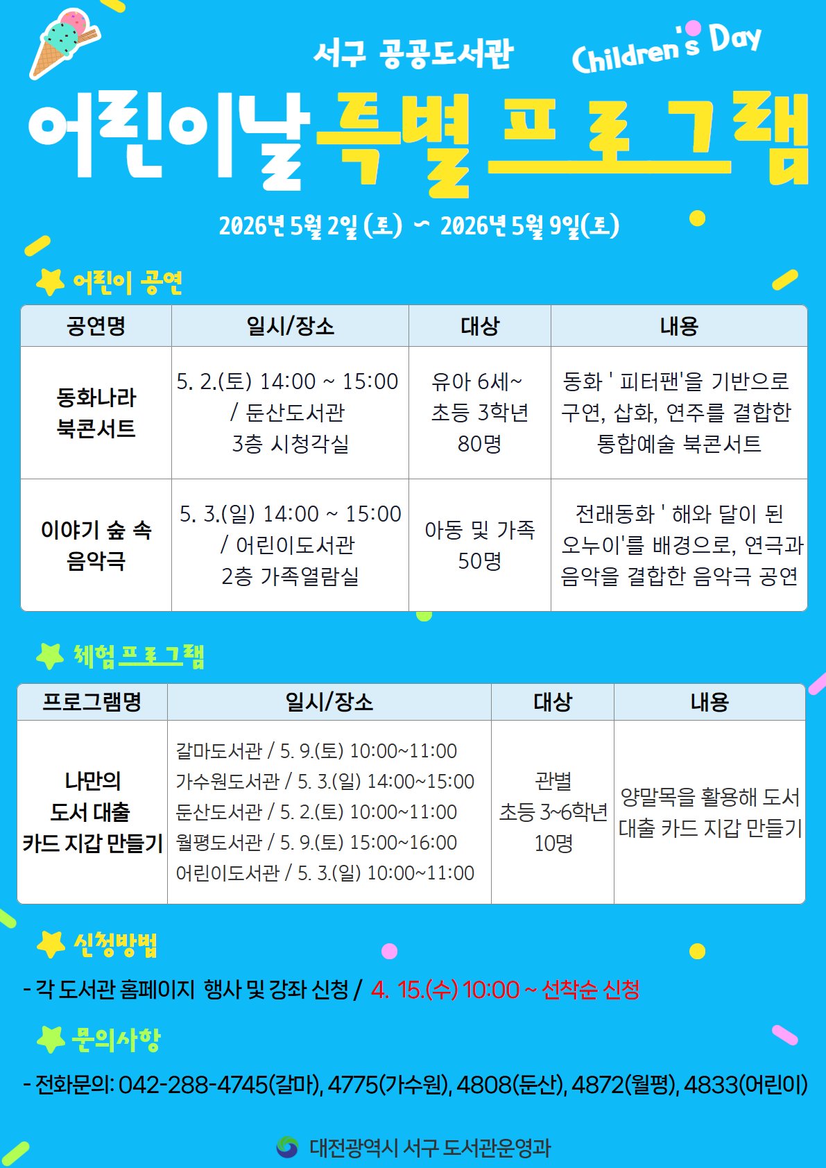 자세한 사항은 홈페이지를 참고하거나 갈마 가수원 둔산 월평 어린이도서관으로 문의하면 된다.