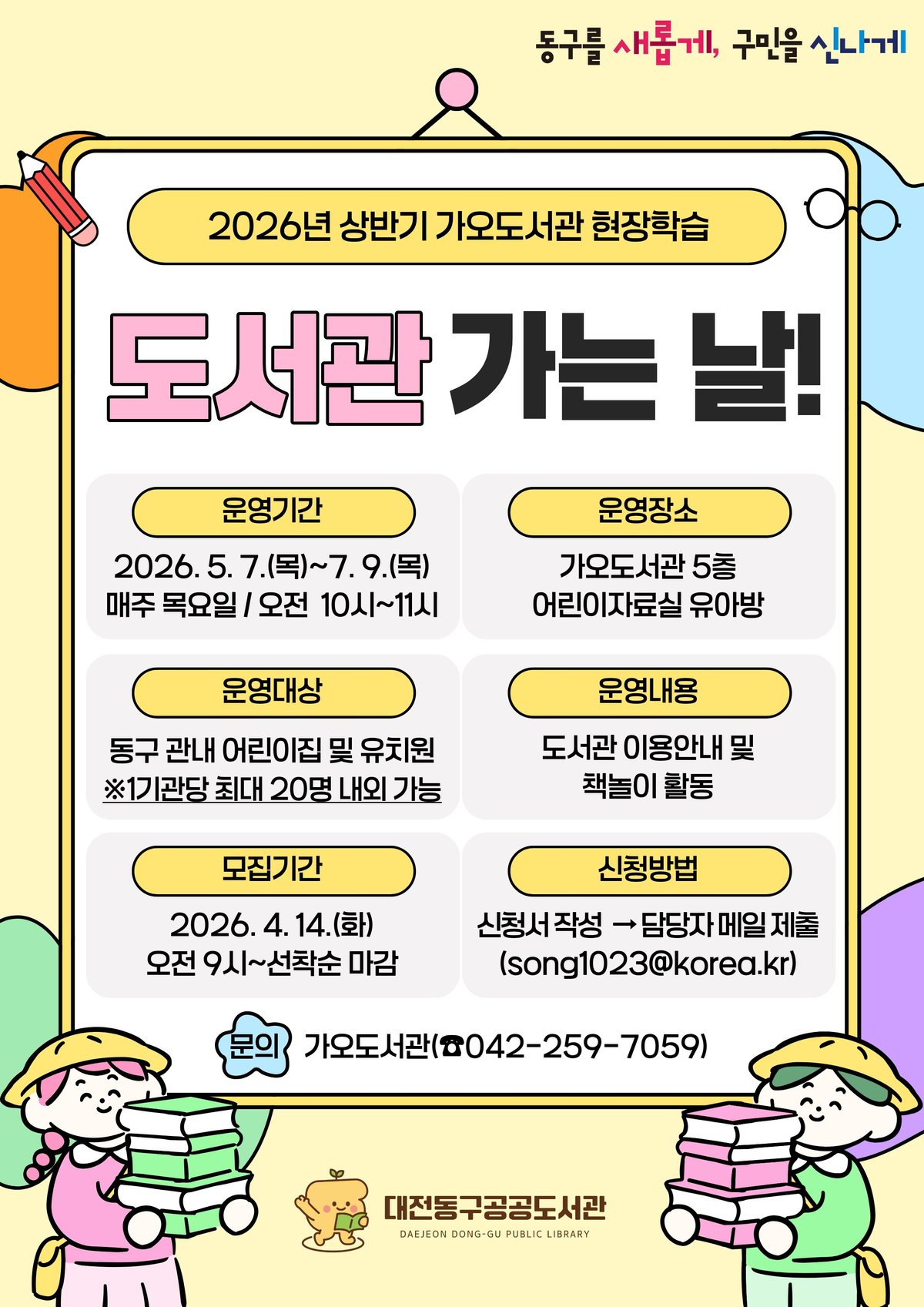 [Ytv영상스토리] 대전 동구는 오는 5월 7일부터 7월 9일까지 매주 목요일 가오도서관에서 ‘도서관 가는 날’현장학습 프로그램을 운영한다고 10일 밝혔다.
