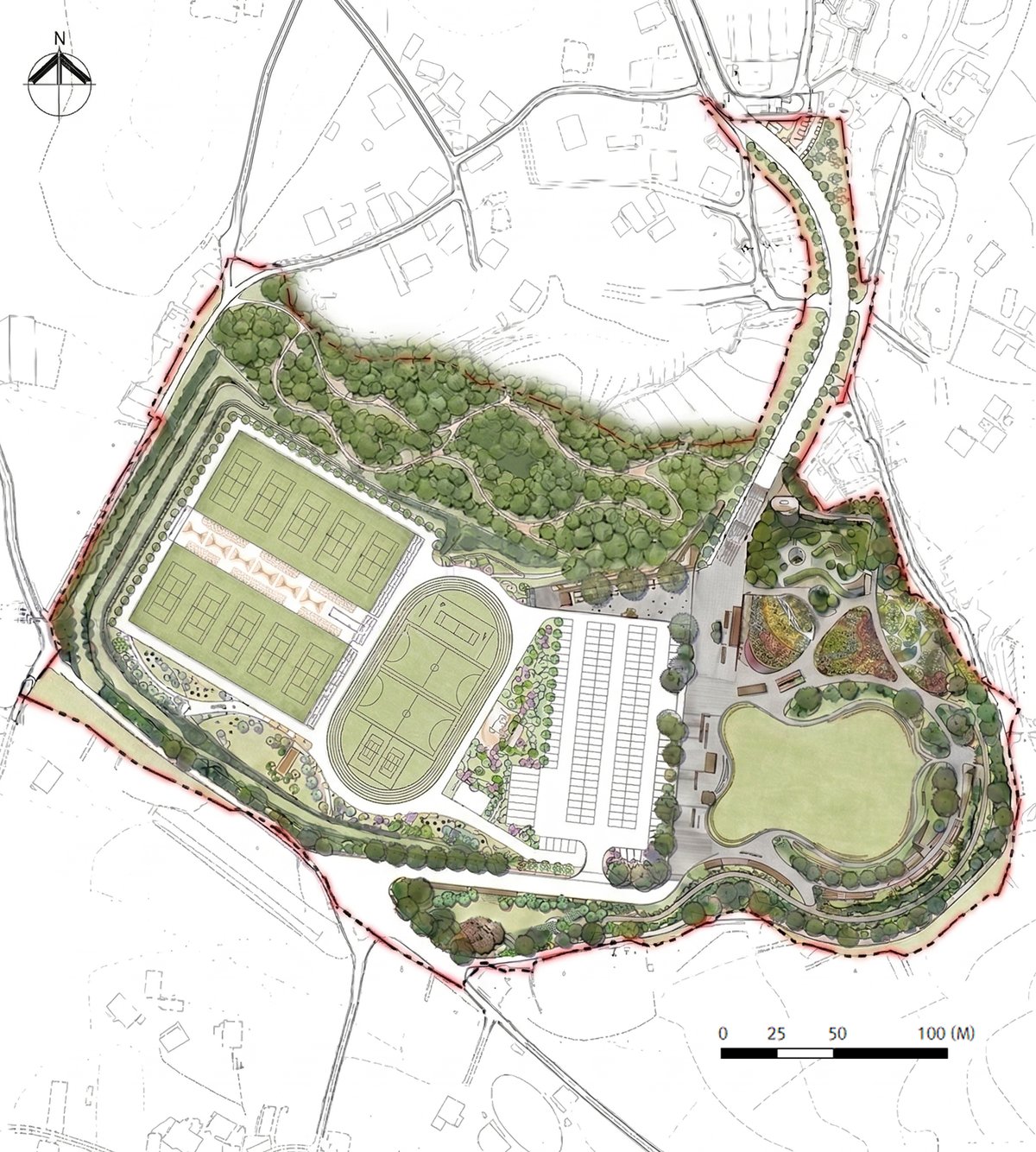 새롭게 조성되는 체육공원은 테니스장과 다용도 트랙, 넓은 잔디광장 등이 들어서며 이용객 편의를 위한 210면 규모의 주차장도 마련된다.