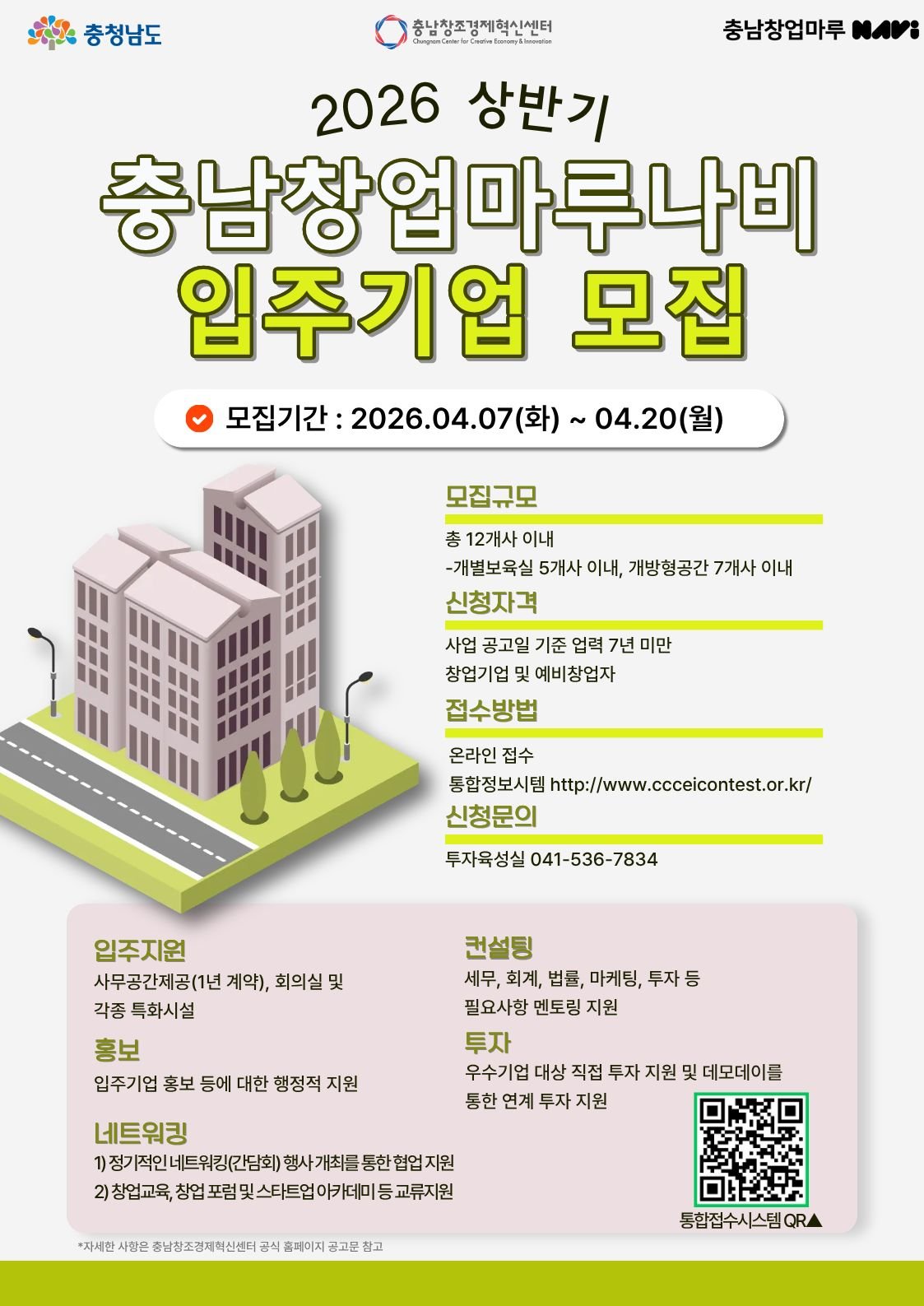 모집기간은 4월 20일 오후 2시까지며 자세한 모집공고 및 지원방법은 충남창조경제혁신센터 공식 홈페이지 및 충남창조경제혁신센터 통합접수시스템에서 확인할 수 있다.