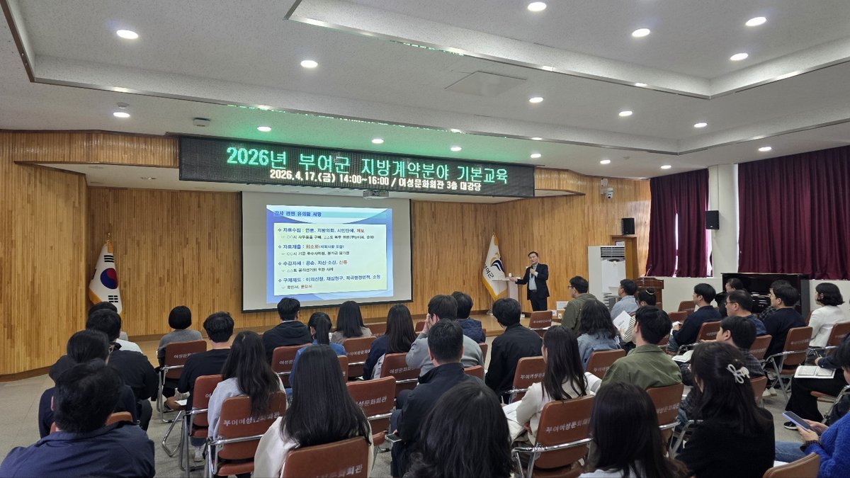 [Ytv영상스토리] 부여군이 회계 및 계약업무 담당 공무원들의 전문성을 강화하고 적극행정 문화를 조성하기 위해 ‘2026년 지방계약분야 기본교육’을 실시했다고 밝혔다.