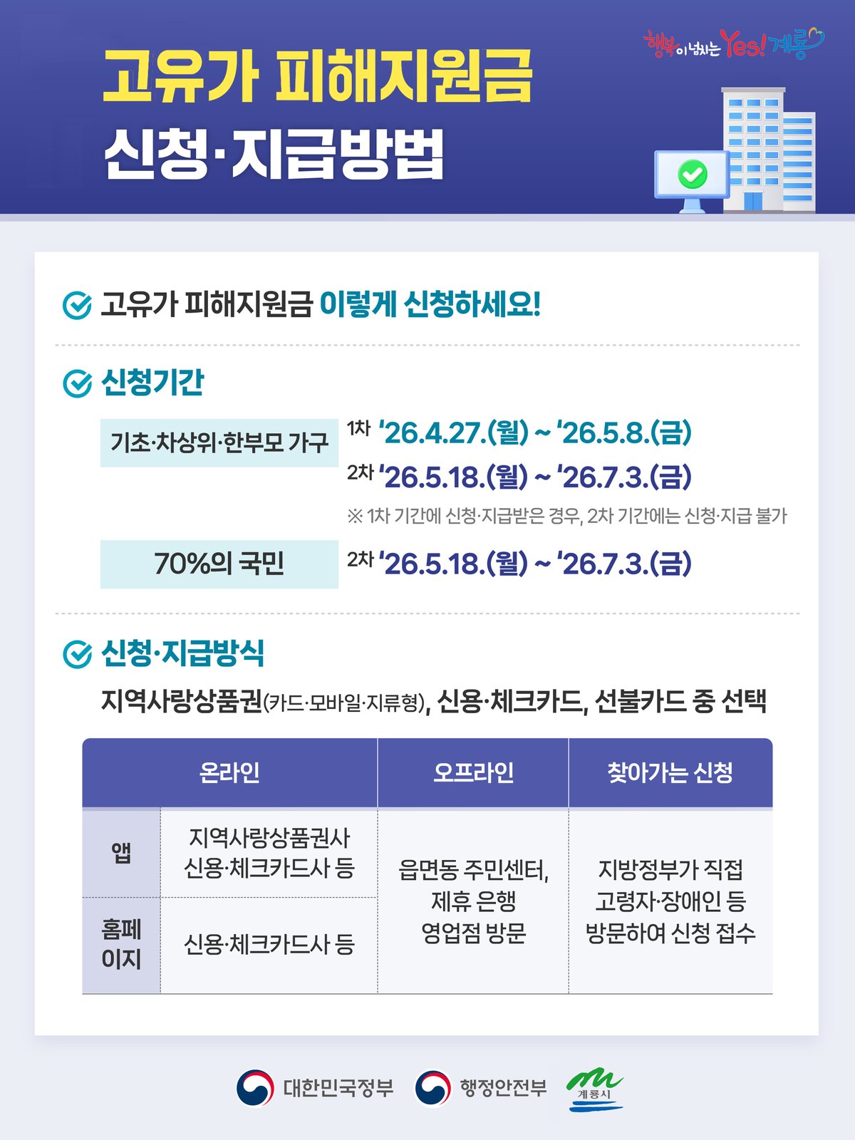 신청은 카드사 홈페이지·앱·콜센터, 카카오뱅크·카카오페이, 모바일 계룡사랑상품권을 통해 가능하며 면·동사무소에서 선불카드로도 신청할 수 있다.
