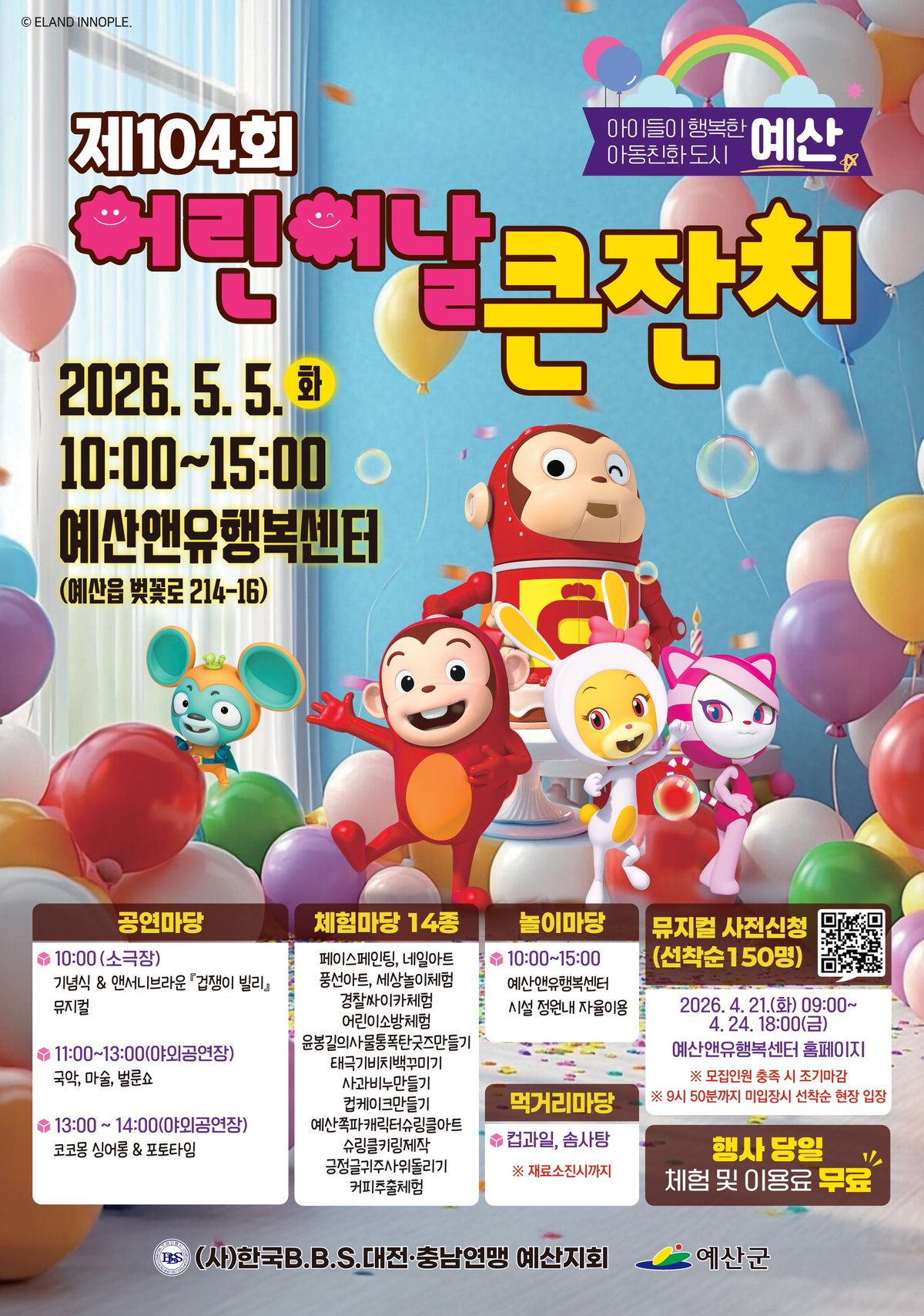 [Ytv영상스토리] 예산군이 제104회 어린이날을 맞아 5월 5일 오전 10시부터 오후 3시까지 예산앤유행복센터에서 기념행사를 개최한다고 밝혔다.