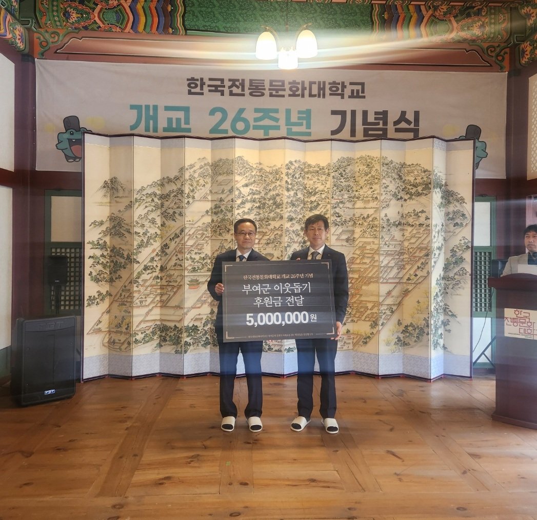 [Ytv영상스토리] 한국전통문화대학교 교직원일동은 개교 26주년 기념행사에서 저소득 가구의 초·중·고 학생 장학금으로 사용해 달라며 이웃돕기 성금 500만원을 부여군에 기탁했다고 22일 밝혔다.