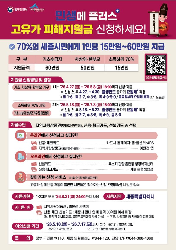 고유가 피해지원금은 2026년 3월 30일 기준 세종시에 주민등록이 된 시민을 대상으로 소득계층에 따라 최대 60만원부터 최소 15만원까지 차등 지급된다.