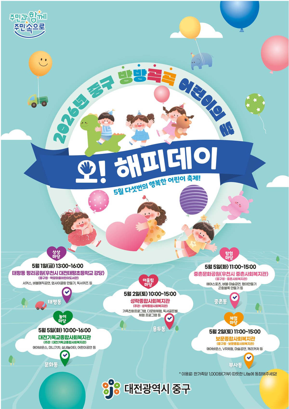 [Ytv영상스토리] 대전 중구가 다가오는 5월 1일부터 5일까지 2026년 중구 방방곡곡 어린이의 달 오 해피데이 어린이달 축제를 개최한다고 밝혔다.