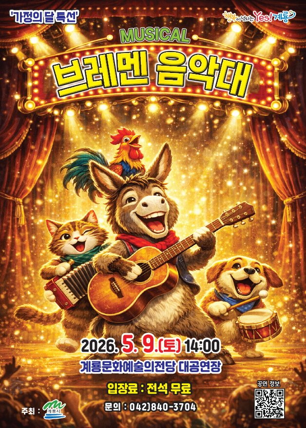 [Ytv영상스토리] 충남 계룡시는 5월 가정의 달을 맞아 어린이 가족이 함께 즐길 수 있는 기획공연, 가족뮤지컬브레멘 음악대를 오는 5월 9일 오후 2시 계룡문화예술의전당 대공연장에서 선보인다.