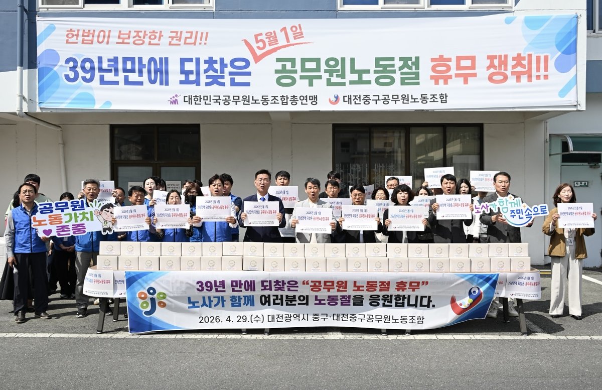 [Ytv영상스토리] 대전중구공무원노동조합은 29일 오전 10시 조합 사무실 앞에서 중구청장 및 노동조합 관계자가 함께 ‘39년 만에 되찾은 공무원 노동절 휴무 기념행사’를 개최하고 63년 만에 노동절 명칭 복원과 120만 공무원, 교사 차별 해소를 경축하는 자리를 가졌다고 밝혔다.