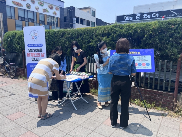 이날 아산시 거주 결혼이주여성은 직접 전통의상을 입고 세계인의 날을 알리고 아산시민은 세계인에게 메시지를 작성하며 서로 이해하고 소통하는 시간을 가졌다.