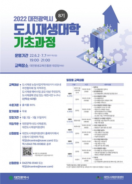 이번 도시재생대학 기초과정 제8기는 다음달 2일 오후 7시 대전평생교육진흥원 대강에서 개강하며 국내 도시재생 전문가들이 도시재생의 이해 도시재생의 어제와 오늘 도시재생의 내일 등을 주제로 강의를 진행할 예정이다.