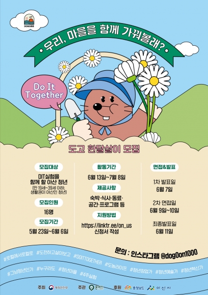 최종 선정된 청년들은 6월 13일부터 7월 8일까지 숙식, 프로젝트 수행비 등을 지원받으며 도고청년마을을 함께 만들어 가는 Do It Together 프로그램, 공동 프로젝트, 도농 라이프 실험, 지역 탐방 등 다양한 일정을 수행하게 된다.
