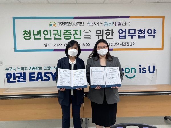 협약식에는 대전인권센터 김종남 센터장과 대전청년내일센터 우수정 센터장이 함께했다.