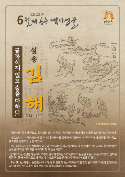 조병철 문화재과장은 “공주 출신의 조선 중기 문신으로서 임진왜란 당시 왜군에 굴복하지 않고 목숨을 바쳐 충성을 다한 김해 선생의 삶과 업적을 기리기 위해 6월의 역사 인물로 선정했다”며 “6월 중 시민을 대상으로 김해 선생 관련 프로그램을 개최할 예정이다”고 말했다.