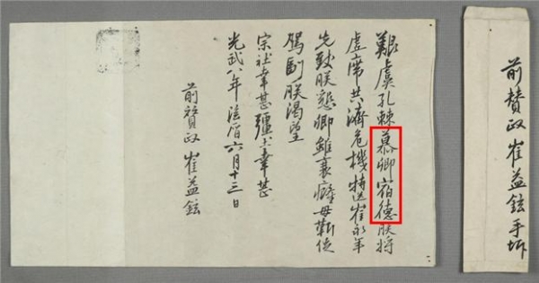 이는 1904년 6월 13일 고종이 최익현선생에게 비밀리에 내린 명령서로 ‘어지럽고 걱정스러움이 가득한 상황에서 경의 높은 덕망을 흠모한다.