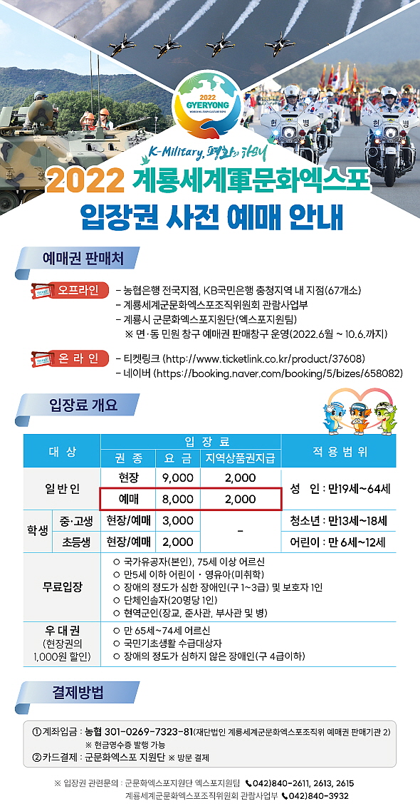 온라인 예매는 티켓링크와 네이버 예약 페이지에서 ‘2022계룡세계軍문화엑스포’를 검색하면 된다.
