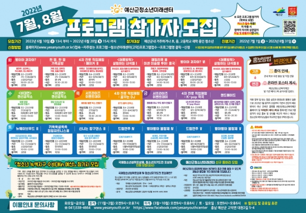 프로그램 참여는 관내 학교 재학생이거나 군에 거주하고 있는 9~24세 청소년을 대상으로 6월 10일 오후 1시부터 20일 오후 3시까지 예산군청소년복지재단 내 홈페이지를 통해 선착순 모집할 계획이라고 전했다.