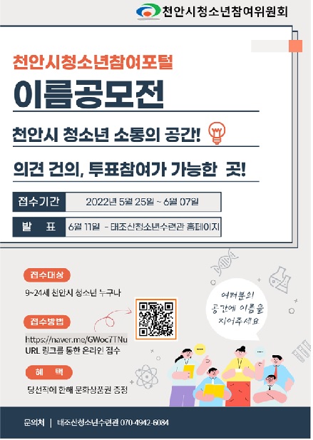 이예본 천안시청소년참여위원회 위원장은 “새로 만들게 되는 천안시청소년참여포털을 통해 청소년들이 지역사회에 관심을 가지고 직접 행동할 수 있는 기회가 더 넓어지게 돼 기쁘다”며 “많은 청소년이 이름 공모전에 참여해 청소년이 주인이 되는 천안시청소년참여포털을 만들어갔으면 한다”고 말했다.