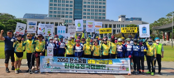 [Ytv영상스토리] 전국자전거길잇기국민연합와 ㈔자전거사랑전국연합회 대전본부는 2일 오후 오후 2시30분 대전시청남문 잔디광장에서 회원과 시민들이 참석한 가운데 2050 탄소중립 실천운동 전국자전거 캠페인을 실시했다.