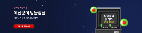 이번 기획전에서는 예산군 브랜드관 입점 전품목에 대해 최대 35% 할인을 진행하며 이달의 제철농산물 대표품목인 방울토마토에 대해 ‘예산군이 방울방울’, ‘방울왕을 찾아라’ 이벤트 등 진행돼 군의 우수한 특산물 홍보는 물론 농가 판매소득 증대 등 큰 효과를 거둘 전망이다.