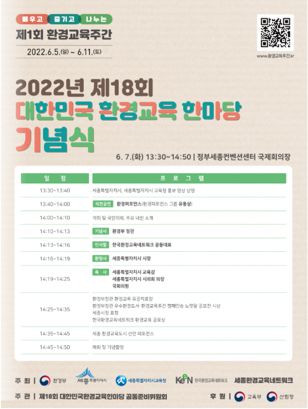 환경교육도시 선포식과 함께 세종 호수공원 일원에서는 온라인 명사특강, 북콘서트, 환경교육박람회 등 다양한 시민참여형 행사가 개최된다.