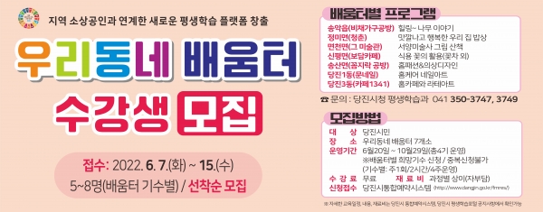 김진호 평생학습과장은 “본사업을 통해 학습자에게는 실용도 높은 내용을 전달하는 근거리 학습터를 제공하고 지역 소상공인에게는 활력을 불어넣을 것으로 기대된다”며 “학습자와 소상공인의 만족도 결과를 토대로 우리동네 배움터를 점차 확대해 나가겠다”고 말했다.