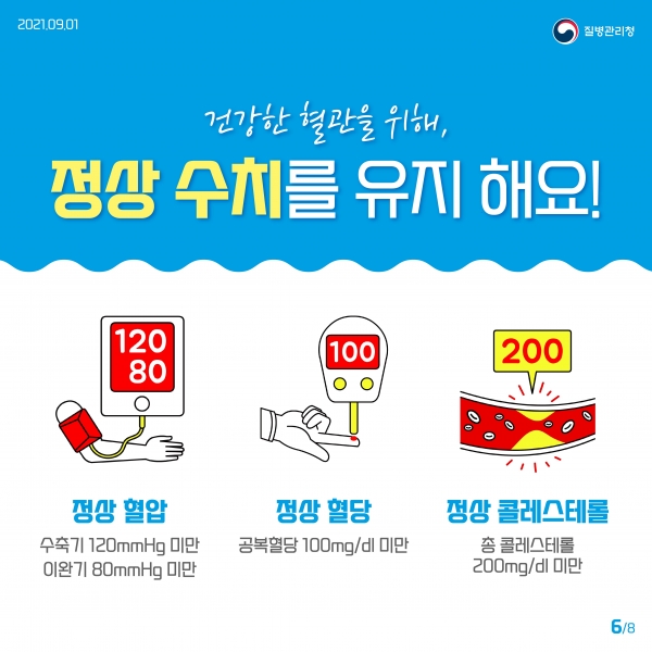 심뇌혈관질환 예방·관리를 위해서는 먼저 자신의 혈압, 혈당, 콜레스테롤 수치를 정기적으로 확인하는 것이 중요하며 이를 통해 심뇌혈관질환으로 인한 조기사망의 80%를 예방할 수 있다.