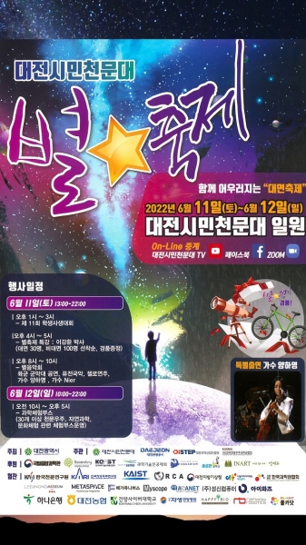 시는 별축제 현장을 직접 방문하기 어려운 시민들을 위해 온라인 ‘대전시민천문대 TV’를 통해 별음악회, 과학특강, 천체관측행사를 생중계 영상으로 제공한다.