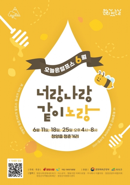 ‘오늘은 알프스’는 문체부의 문화가 있는 날 지역특화프로그램 공모사업으로 ‘청년협동조합 청양사람’이 주관하고 컨소시엄단체 ‘극단이야기공장’, ‘청양사회경제네트’ 외 6개 단체가 협업하는 청춘거리 활성화를 위한 문화사업으로 오는 10월까지 계속된다.