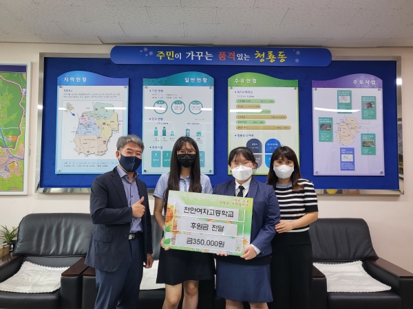 임병학 청룡동장은 “천안여고 학생들과 학교 구성원들의 아름다운 마음이 모여 지역 사회가 더 밝아지는 것 같다”며 “소중한 정성과 마음까지 담아 잘 전달하겠다”고 밝혔다.