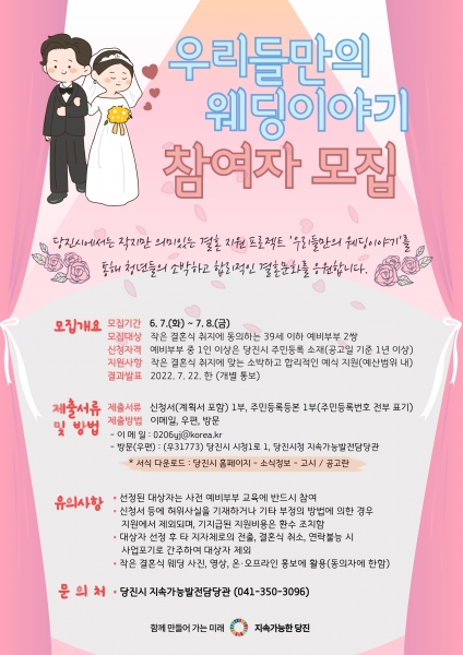 [Ytv영상스토리] 당진시는 작지만 의미있는 결혼 지원 프로젝트 ‘우리들만의 웨딩이야기’에 참여할 청년 예비부부 2쌍을 오는 7월 8일까지 모집한다.