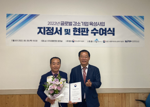 [Ytv영상스토리] 세종테크노파크는 2022년 세종 글로벌 강소기업으로 선정된 ㈜대명연마 를 방문해 글로벌 강소기업 지정서와 현판 수여식을 지난 9일 개최하고 4년간 기업맞춤형 밀착지원을 약속했다.