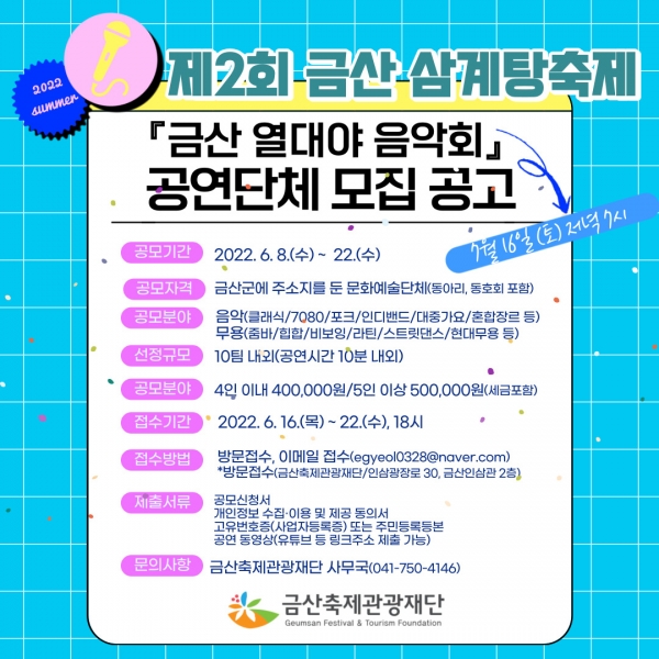 제2회 삼계탕축제 금산 열대야 음악회 공연단체 모집에 관한 자세한 내용은 재단 홈페이지를 참고하거나 사무국에 문의하면 된다.