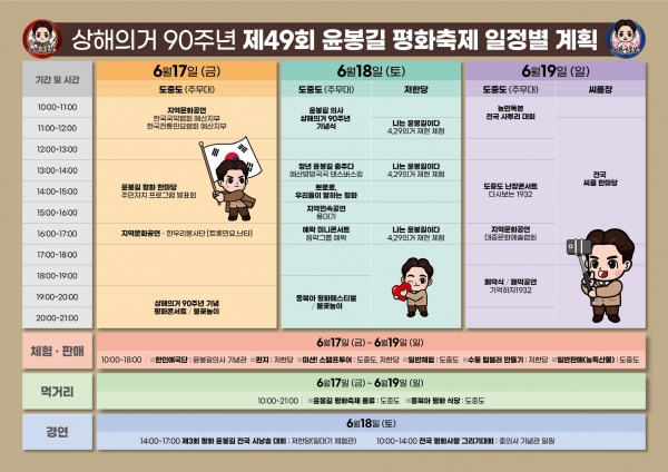 또한 18일 오전 9시 윤봉길의사 상해의거 90주년 및 탄신 114주년 기념행사인 ‘영정모시기 거리 퍼레이드’를 시작해 공식 기념식이 도중도 주 무대에서 펼쳐지며 1932년 4월 29일 상해의거를 실제 상황처럼 체험할 수 있는 재현체험 프로그램이 같은 날 오전과 오후 3회에 걸쳐 저한당에서 진행된다.