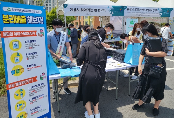 시는 지난 5월과 6월 두차례에 걸쳐 엄사면과 신도안면 일원에서 진행된 환경교육에서 전국민을 대상으로 의무 시행되는 투명 페트병 분리배출과 지구 온난화 예방 방법 등을 홍보하고 교육 참여 시민에게 재활용품 배출을 위한 분리수거함을 배부하며 시민참여를 유도했다.