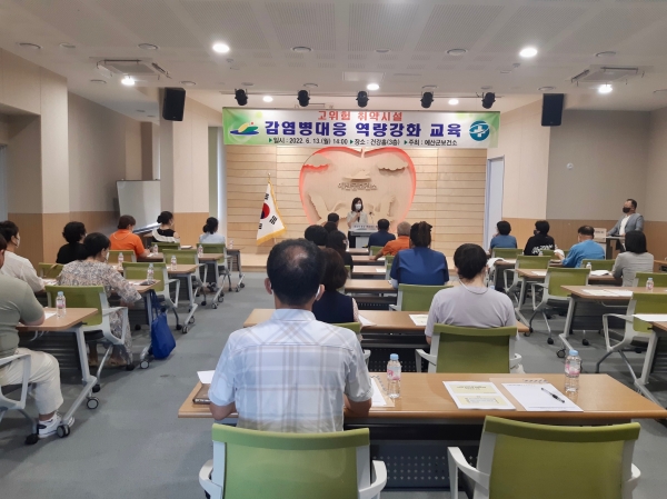 [Ytv영상스토리] 예산군보건소는 요양시설·병원 등에서 고위험 중증자 발생 및 사망우려가 높다는 판단에 따라 감염취약시설의 감염을 조기에 감지하고 대처하기 위해 지난 13일 관내 감염취약시설 시설장 및 감염관리자 40여명을 대상으로 ‘코로나19 감염대응 역량강화 교육’을 실시했다.