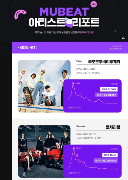 [Ytv영상스토리] 그룹 투모로우바이투게더와 르세라핌이 뮤빗 아티스트 리포트 6월 호 ‘이달의 HIT 아티스트’로 선정됐다.