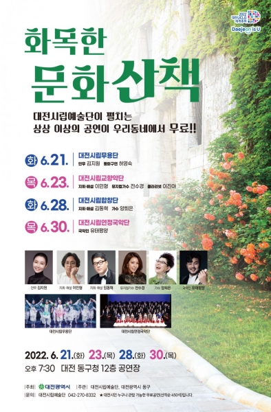 [Ytv영상스토리] 대전시립예술단은 오는 6월 21일부터 총 4회에 걸쳐 대전 시민을 위한‘우리 동네 문화 가꾸기-화목한 문화 산책’공연을 개최한다고 밝혔다.