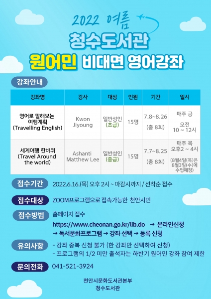 청수도서관 관계자는 “여행을 주제로 운영되는 원어민 강좌를 통해 영어와 친숙해지는 휴가를 떠나보시길 바란다”고 밝혔다.